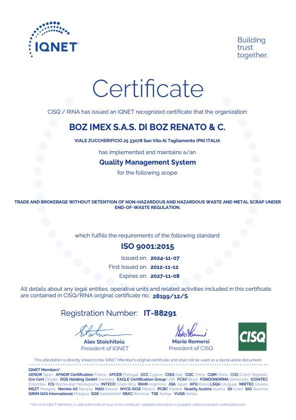 Quality Management System for the activities of trade and brokerage without detention of non-hazardous and hazardous waste, and metal scrap under End-of-Waste regulation.
