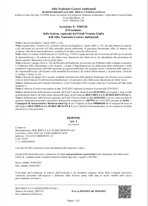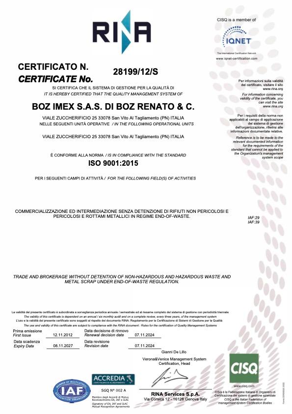 Sistema di Gestione Qualità per l'attività di commercializzazione ed intermediazione senza detenzione di rifiuti non pericolosi e pericolosi, e rottami metallici in regime End-of-Waste.